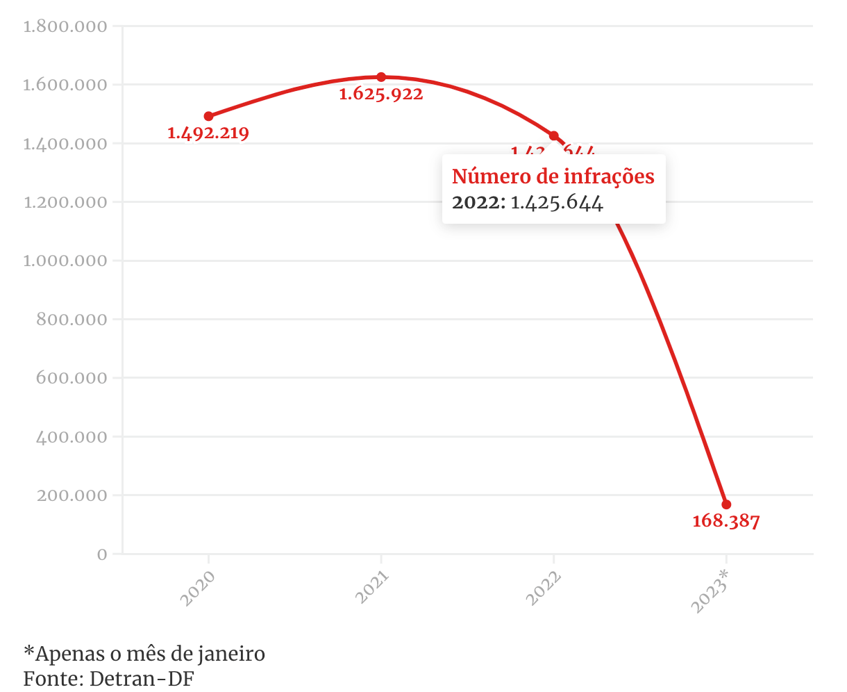 O ano em que mais houve infrações por excesso de velocidade foi 2021, quando a capital federal registrou 1,6 milhão de multas (ou 4.454 por dia).